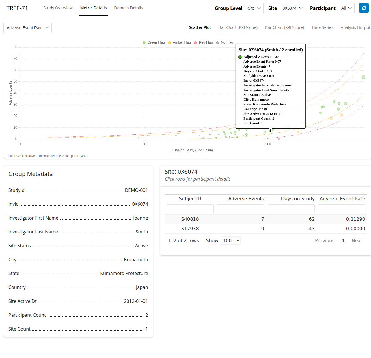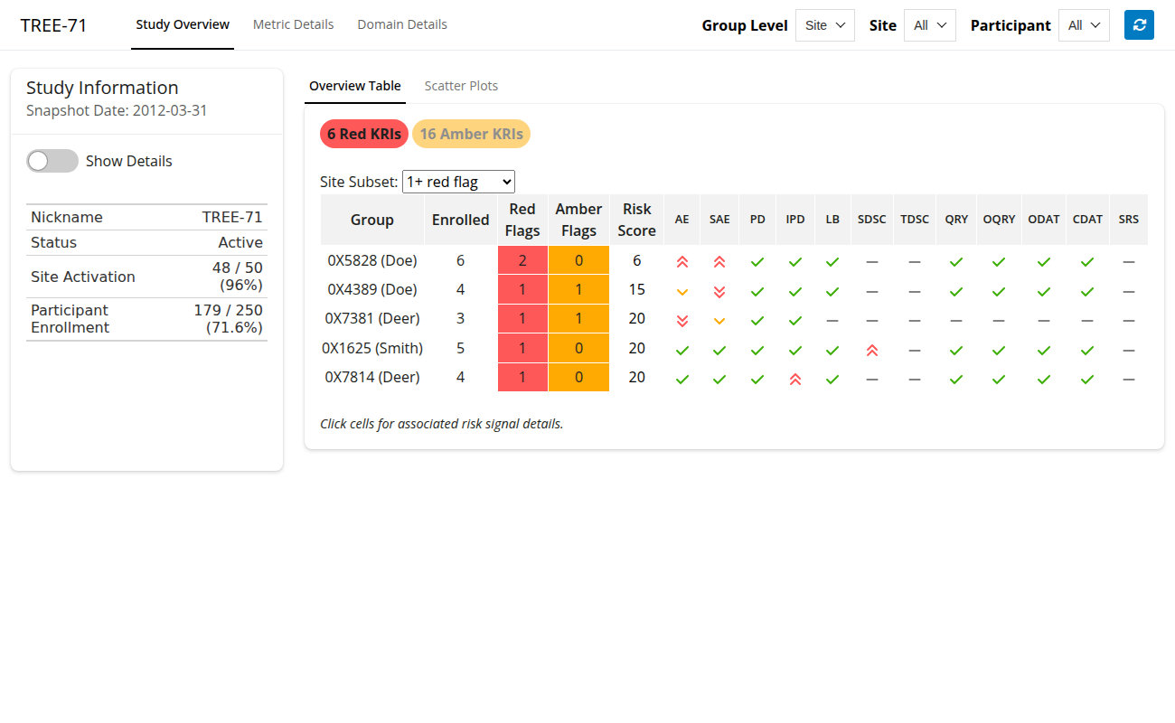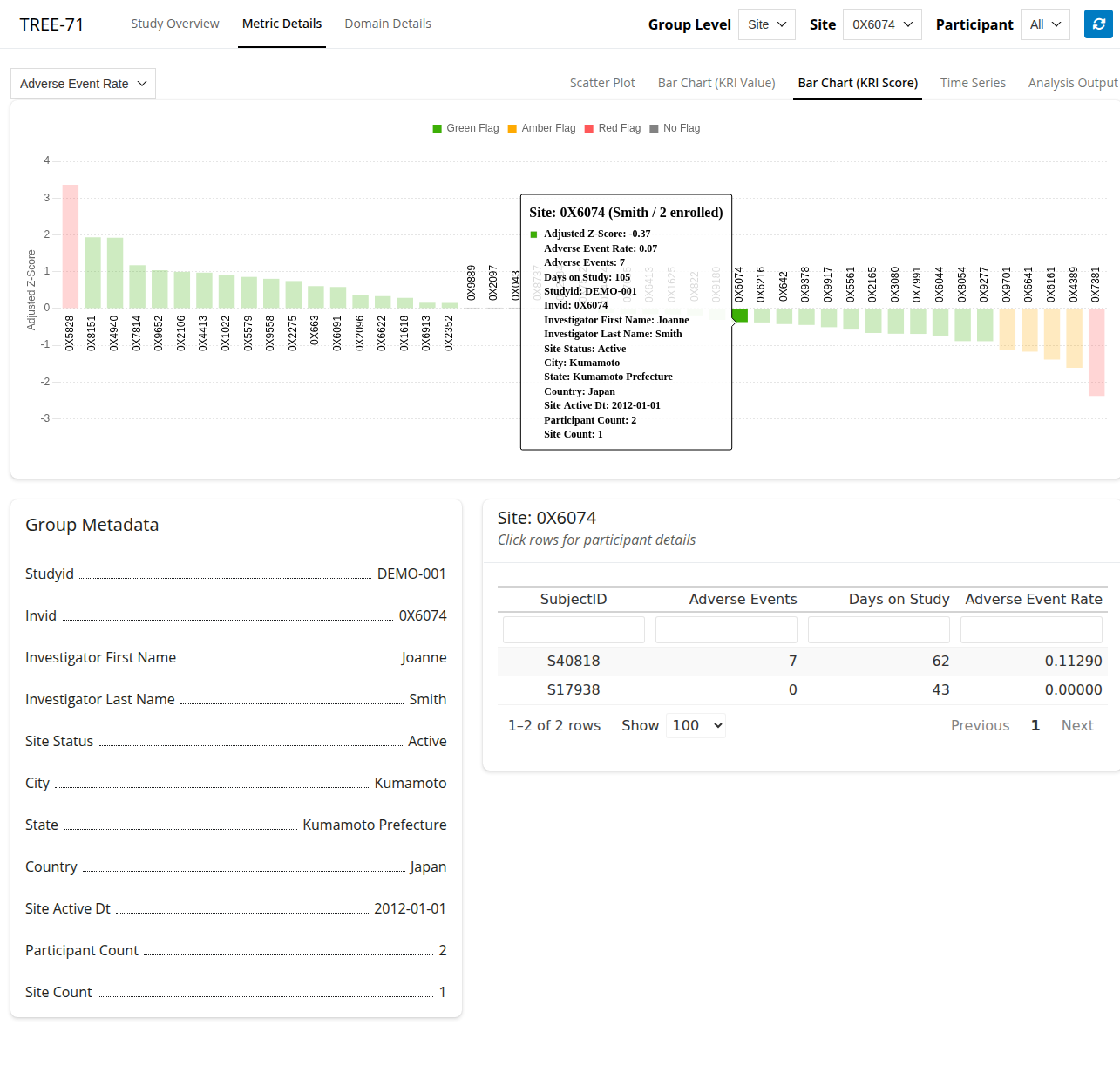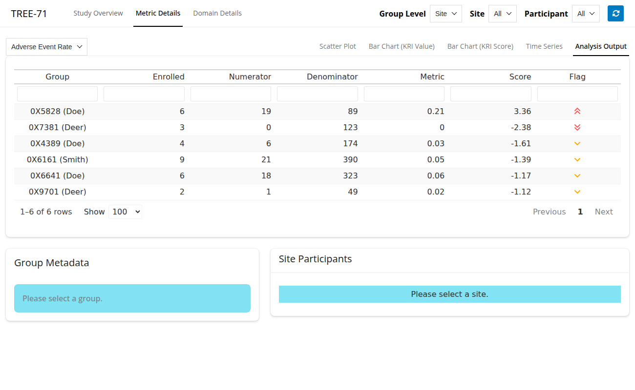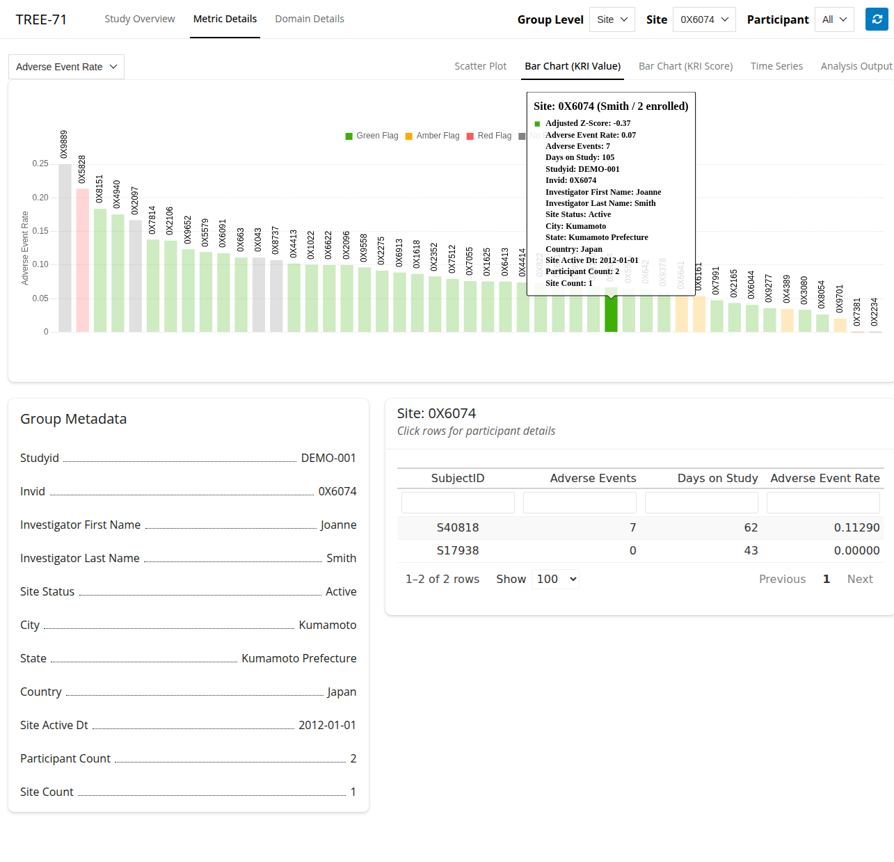 The participant table shows each participant’s numerator, denominator, and metric values for the selected KRI.