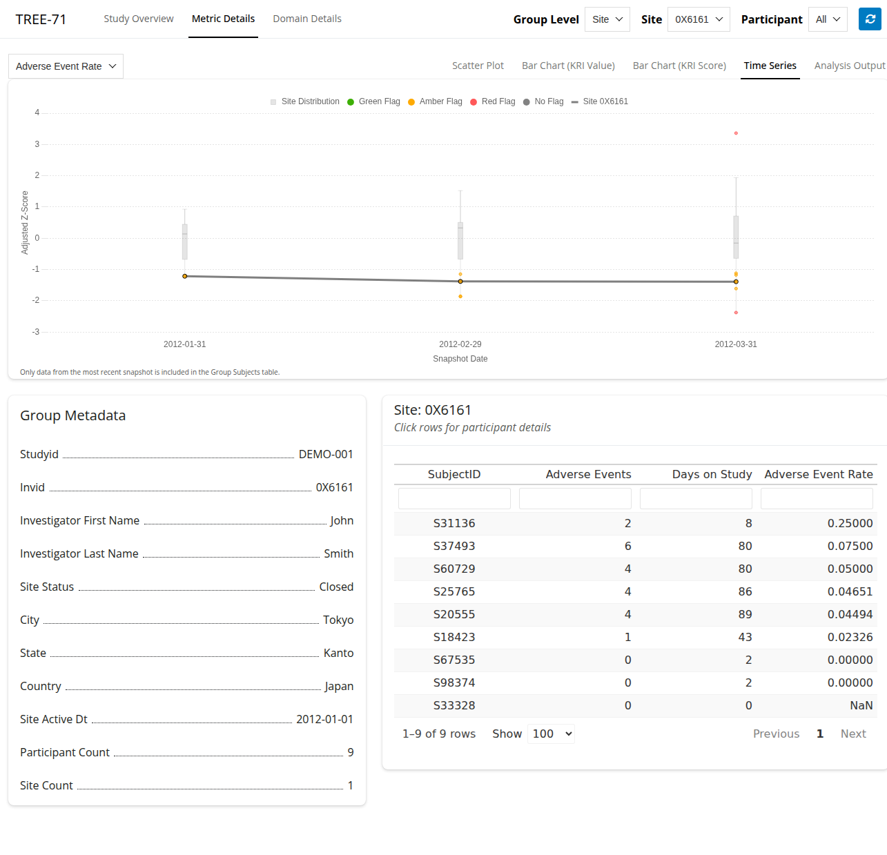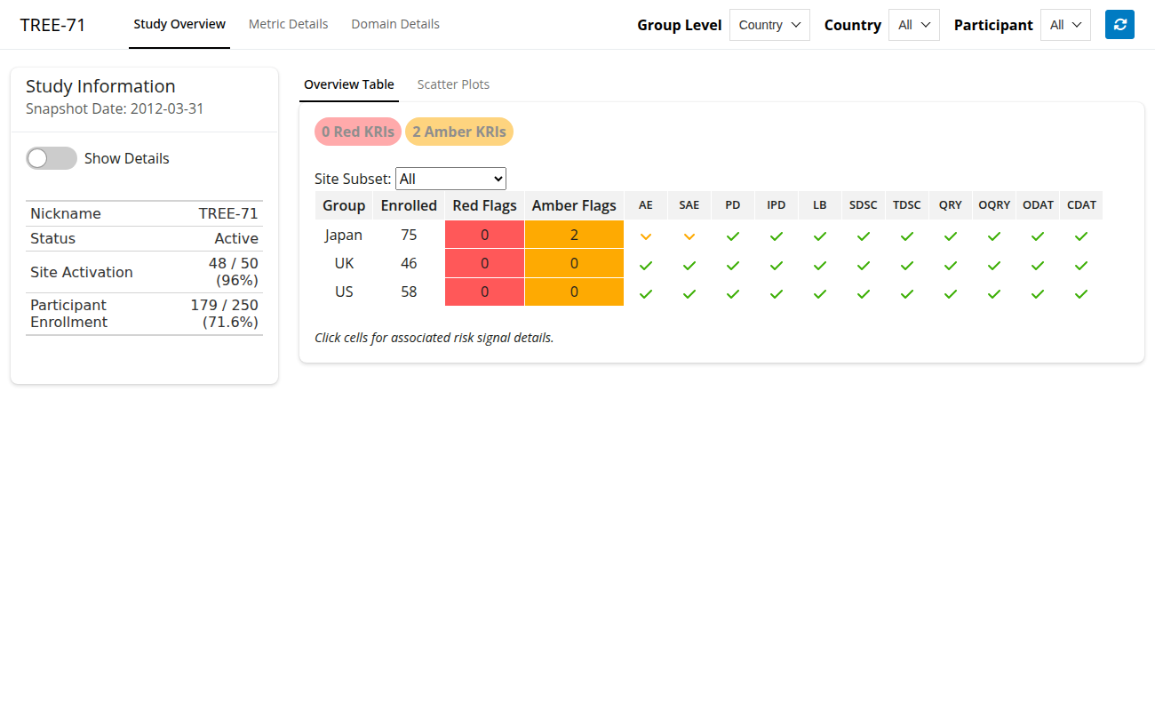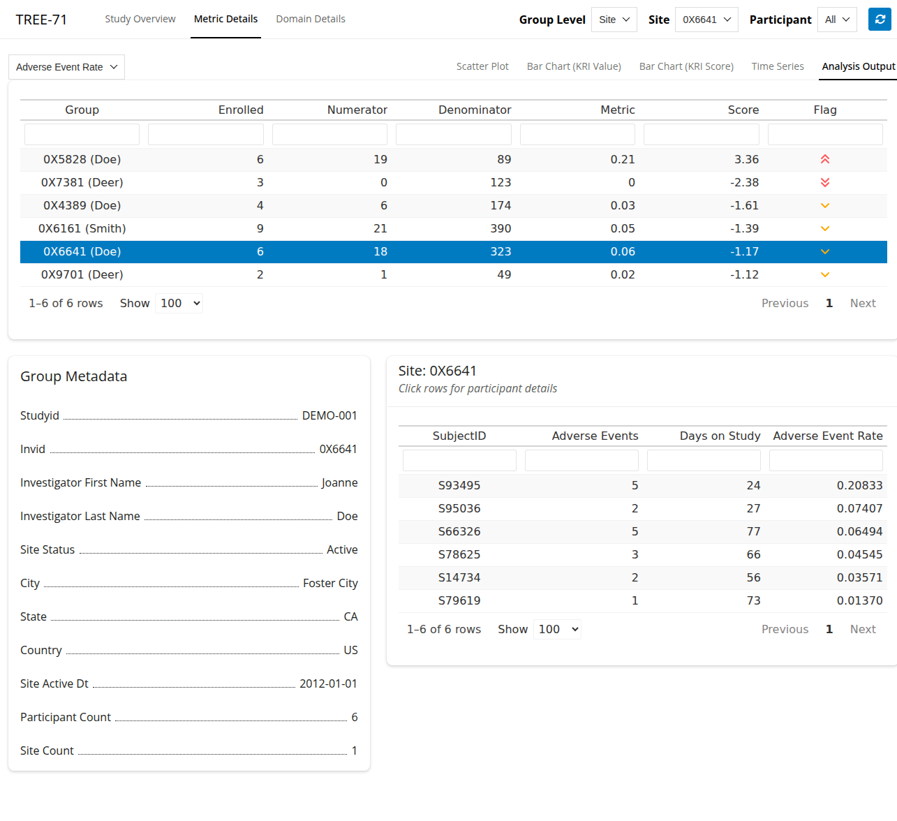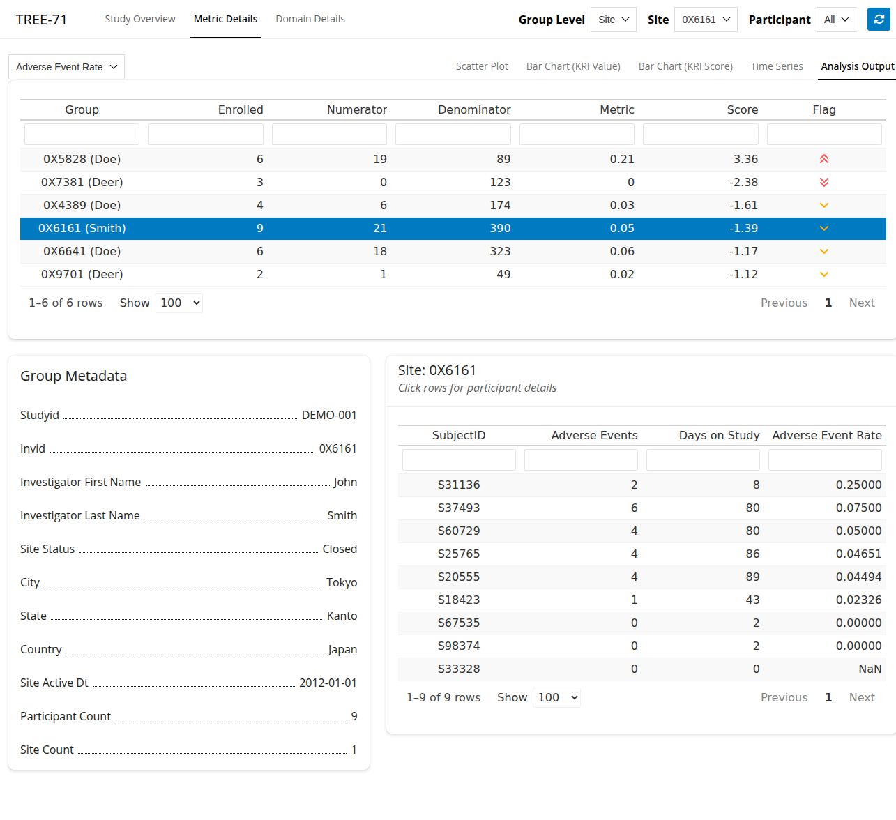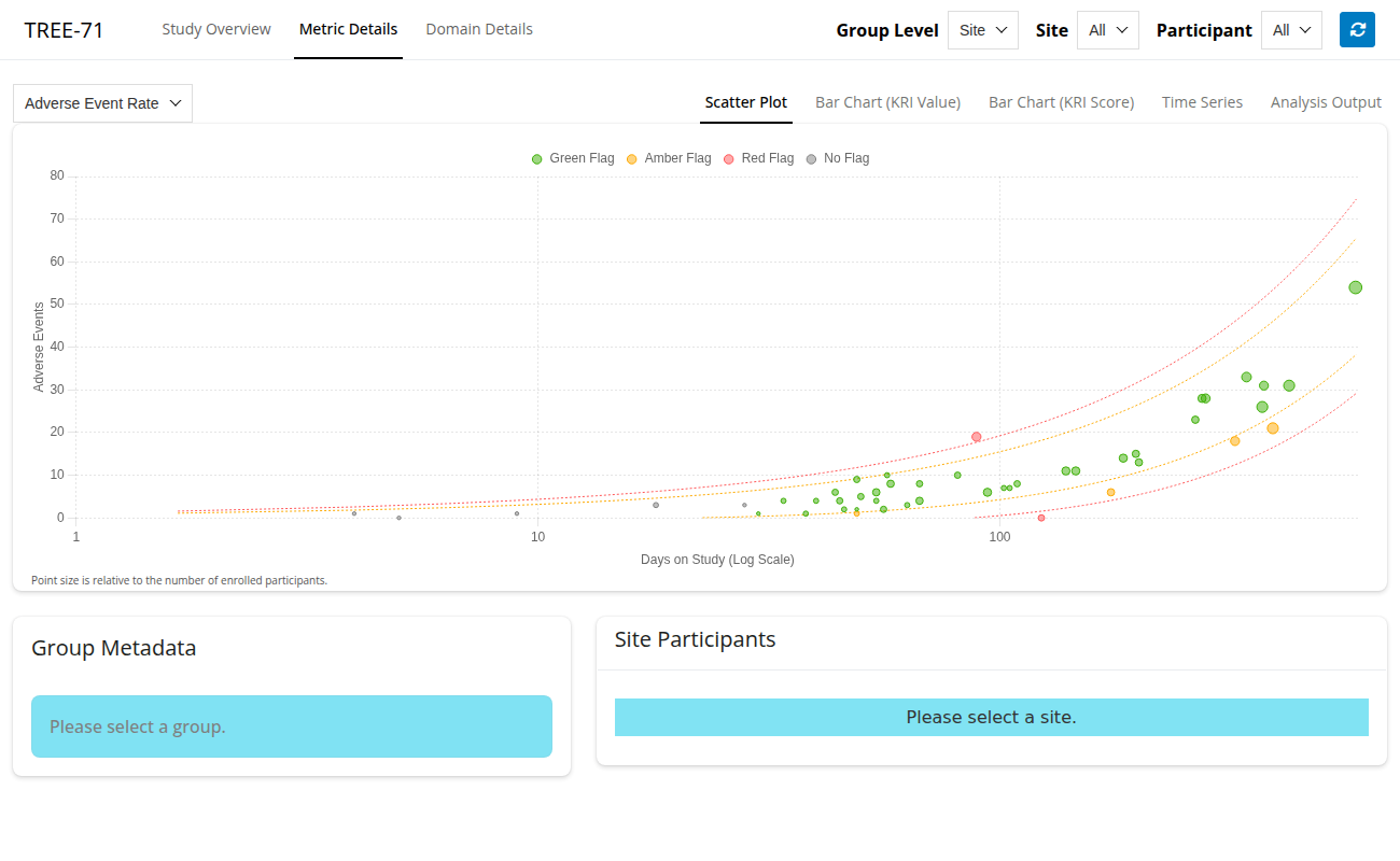 The participant table shows each participant’s numerator, denominator, and metric values for the selected KRI.
